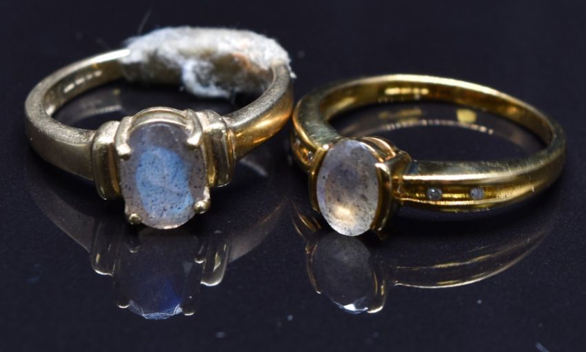 Two 9ct gold rings set with labradorite, size N, 5.7g