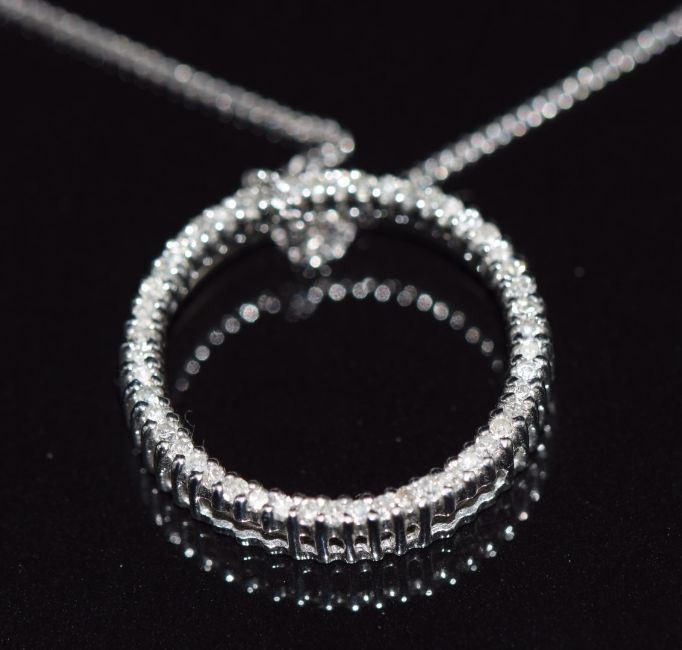 A 10k white gold circular pendant set with diamonds, 1.8g, 1.8cm diam with silver chain