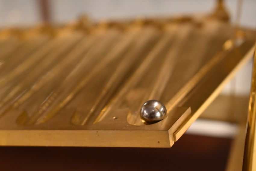 Devon Clocks Congreve rolling ball clock, the three enamelled chapter rings with Arabic numerals, the fusee movement supported on four finialled plain tapered columns, in mahogany framed glass case, H40 x W36cm