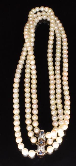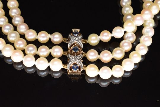 A three strand cultured pearl necklace with 9ct gold clasp set with sapphires and diamonds