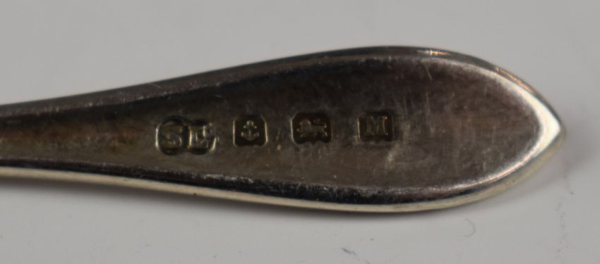 Edward VIII set of six hallmarked silver coffee spoons, Birmingham 1936, maker William Suckling Ltd, length 9.5cm, weight 51g, together with nine continental silver spoons, most marked 800, some higher grades, weight 93g