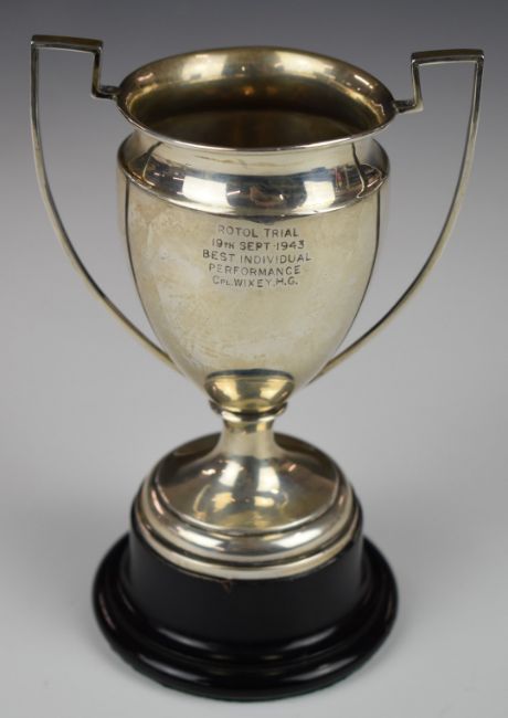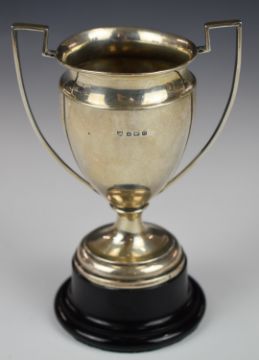 George V hallmarked silver twin handled trophy cup, Birmingham 1931, maker J A Wylie & Co, weight 110g, on ebonised base, overall height 17cm