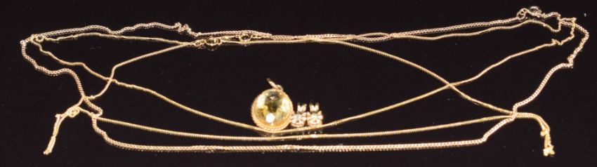 Three 9ct gold necklaces/ chains and three 9ct gold pendants set with topaz, peridot and citrine, 7.3g