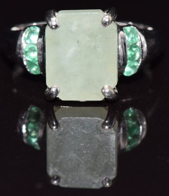 A 9ct white gold ring set with emeralds and chrysoprase, size J, 3.1g
