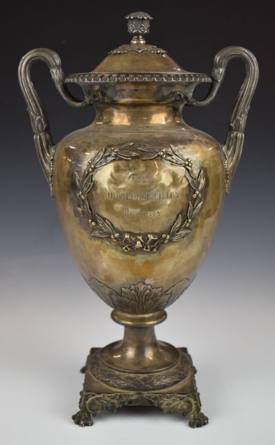 Large Victorian hallmarked silver two handled lidded trophy cup with acanthus leaf decoration, raised on square base supported by four lions paw feet, London 1842, maker Benjamin Smith III, height 43.5cm, width 26cm, weight 2460g
