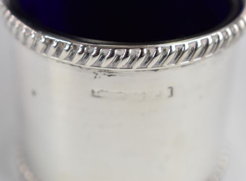 Georgian hallmarked silver mustard pot with blue glass liner, Sheffield 1824, maker's mark indistinct but likely Thomas Watson & Co, height 7cm, weight without liner 179g, together with a silver plated spoon to suit