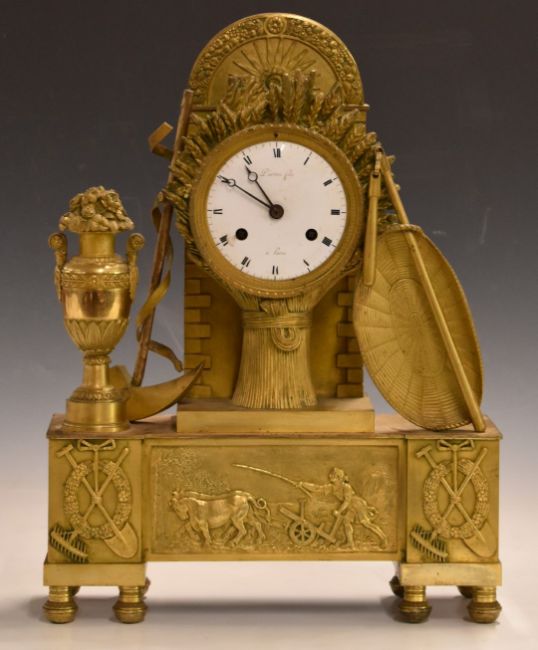 Brass figural 19thC French mantel clock mounted with farming related items, the enamelled Roman dial with Breguet style hands, signed Dartois Fils à Paris, the two train movement striking on a bell, H44cm