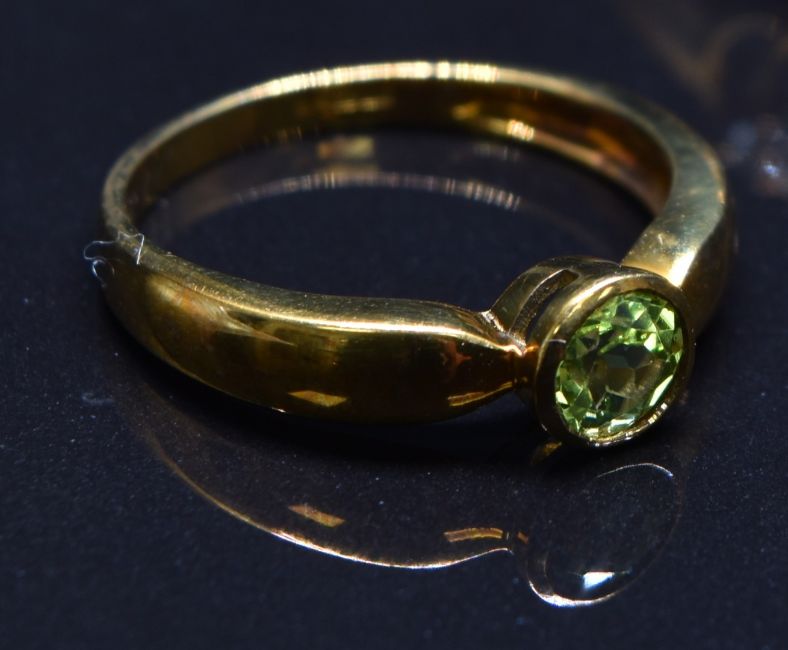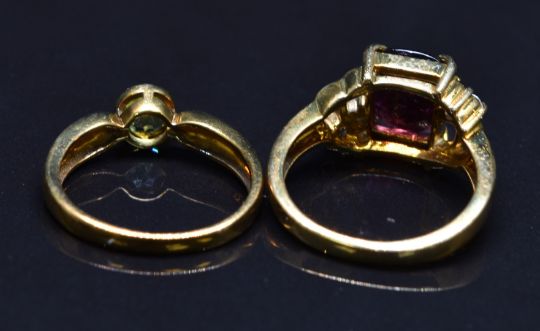 Two 9ct gold rings set with peridot and garnets, size N, 6.5g