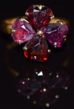 Victorian 22ct gold ring set with four heart shaped garnets forming a four leaf clover, in vintage velvet box, size L, 4g