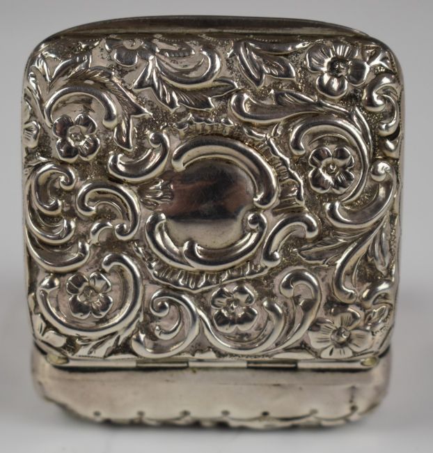 Victorian hallmarked silver snuff or similar box with embossed decoration and gilt interior, Birmingham 1893, maker Deakin & Francis Ltd, width 5cm, weight 30g