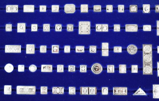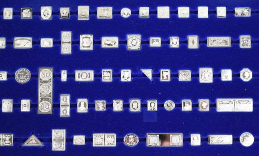 Franklin Mint The 100 Greatest Stamps of the World sterling silver miniature collection, in fitted case together with further box containing cards relating to the stamps and a set of tweezers. Width of main case 43cm