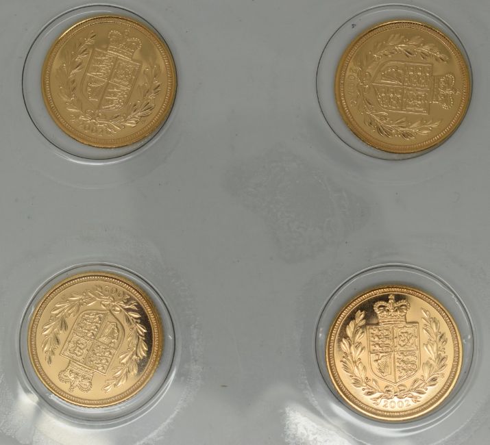 Four 2002 gold half sovereigns, shield reverses, in bubble pack