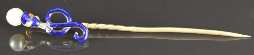 Victorian yellow metal stick pin in the form of a snake/ serpent set with blue enamel and holding a faux pearl, 1.9g