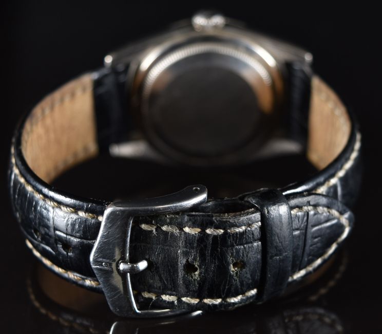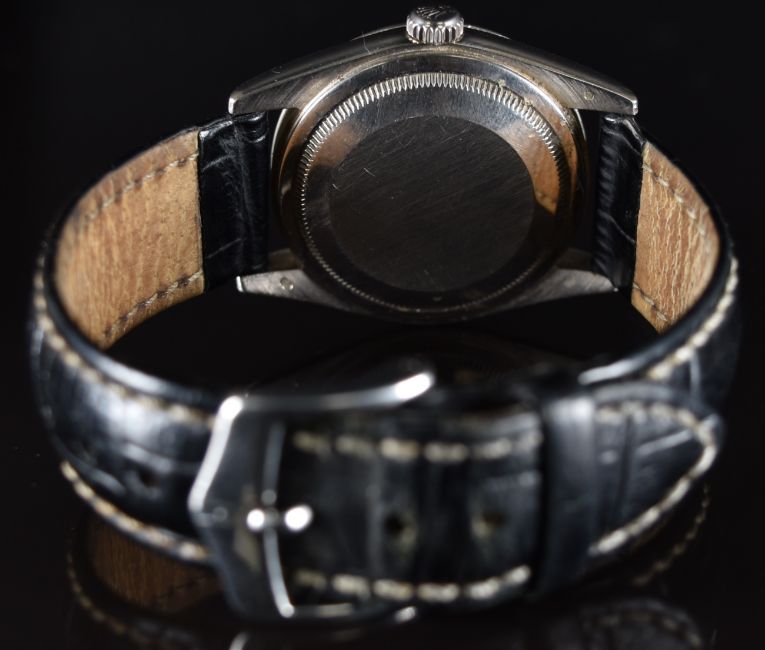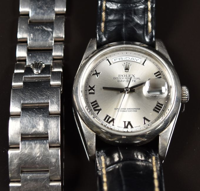 Rolex Oyster Perpetual Day-Date 18ct white gold gentleman's automatic wristwatch ref. 118238 with day and date apertures, Roman numerals, black and silver hands hands, silver dial and signed calibre 3155 movement, on black leather strap, case diameter 36m, in original travel pouch with original 18ct white gold bracelet.