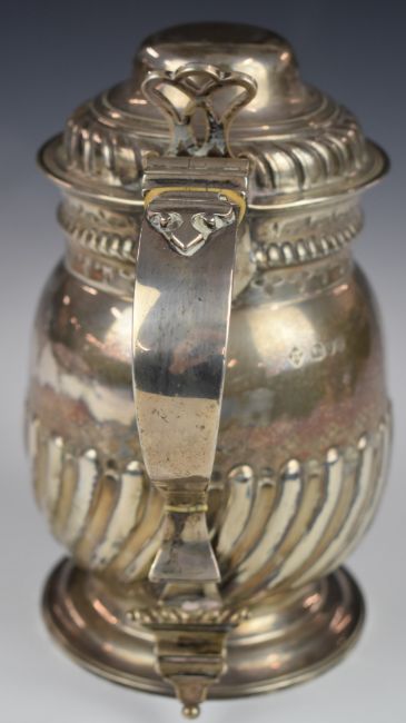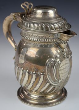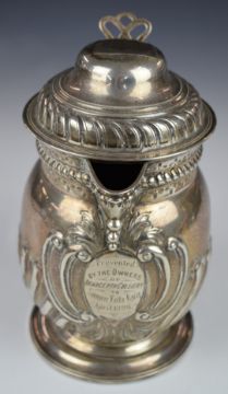 Victorian hallmarked silver presentation lidded jug, with ivory insulated scrolling handle and gilt wash interior, London 1891, maker Martin, Hall & Co, height 20cm, weight 839g