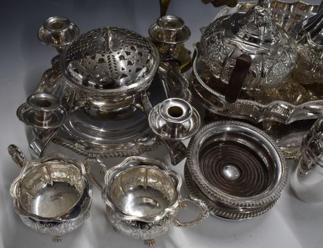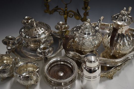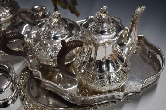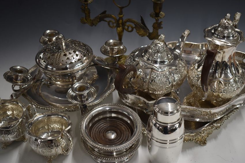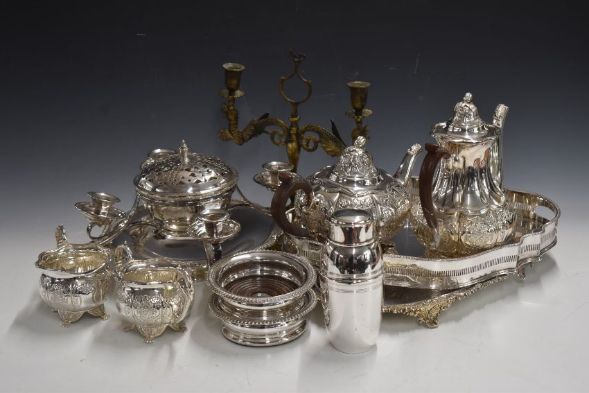 Silver plated ware including Mappin & Webb candle holder centerpiece, galleried tray, oval tray, pedestal bowl, teaset and cocktail shaker