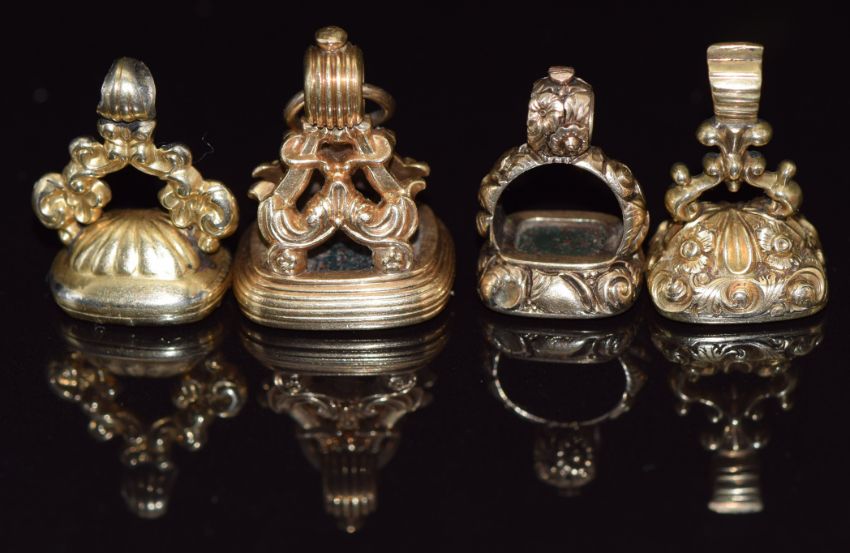 Four Victorian intaglio seals/ fobs set with agate, one carved as a phoenix, one reading 'Friend' and one a tree