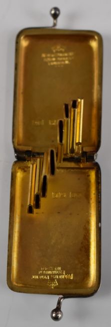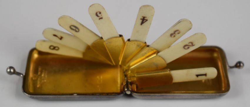 Albert Barker Edward VII hallmarked silver shooting butt marker, the opening of the case causing the holders to form a fan, the ivory markers marked 1 to 8, London 1902, length when opened 10cm, in original fitted case
