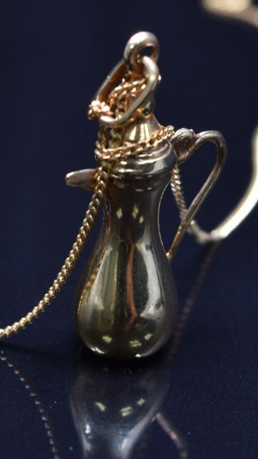 An 18ct gold necklace/ chain and an 18ct gold pendant/ charm in the form of a jug, 4.1g
