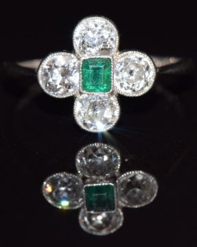 Edwardian 18ct white gold ring set with four old cut diamonds each approximately 0.22ct and an emerald in a platinum setting, size L, 2.8g