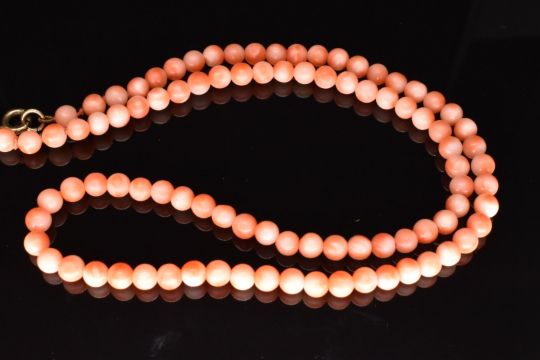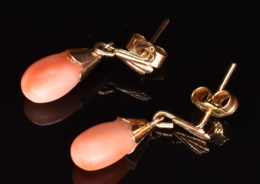 A single strand of coral beads, pair of 9ct gold earrings set with coral and a Whitby jet brooch inlaid with mother of pearl