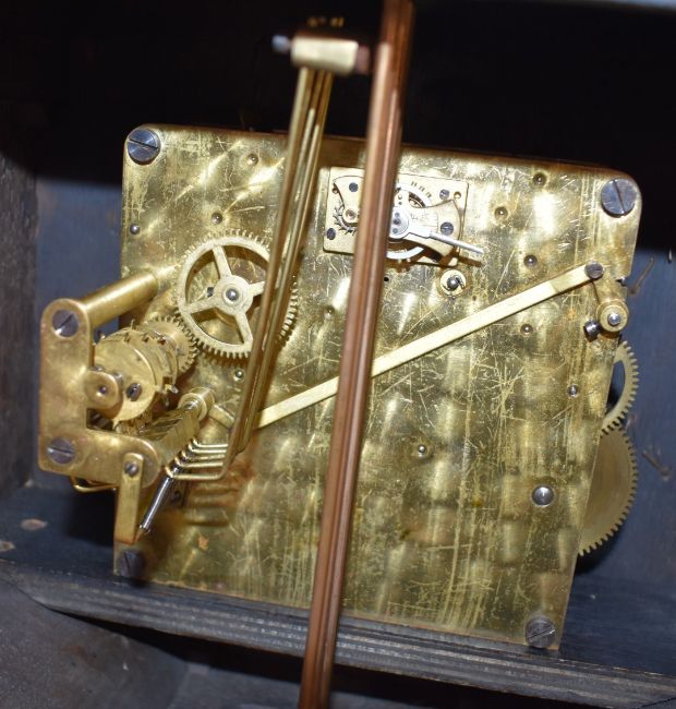 Oak cased c1920 carved drop dial wall clock with Roman brass numerals and three train movement striking on a gong