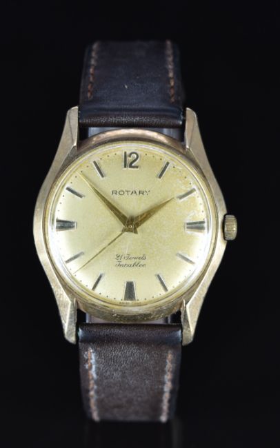 Rotary 9ct gold gentleman's wristwatch with gold dauphine hands and baton hour markers, champagne dial and 17 jewel movement, on brown leather strap, case diameter 34mm.