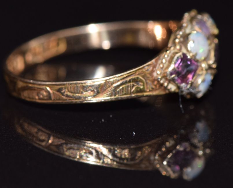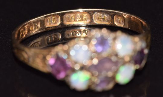 A 15ct gold ring set with opals and amethysts, Birmingham 1873, size L, 1.4g