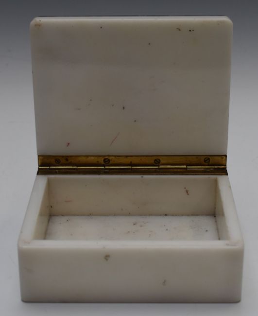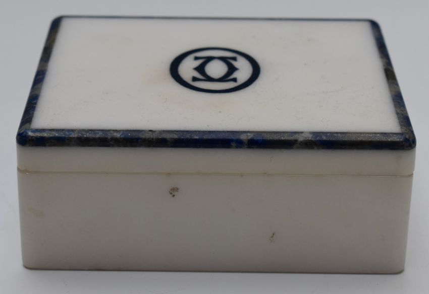 A marble and lapis lazuli/ sodalite jewellery or trinket box with inlaid Cartier symbol to the lid, 13.5 x 11 x 5.3cm