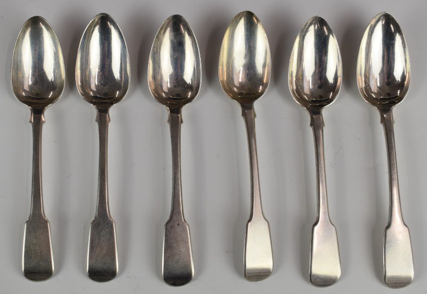 Georgian set of six hallmarked silver fiddle pattern dessert spoons, London 1818, maker Sarah Purver, length 18cm, weight 295g