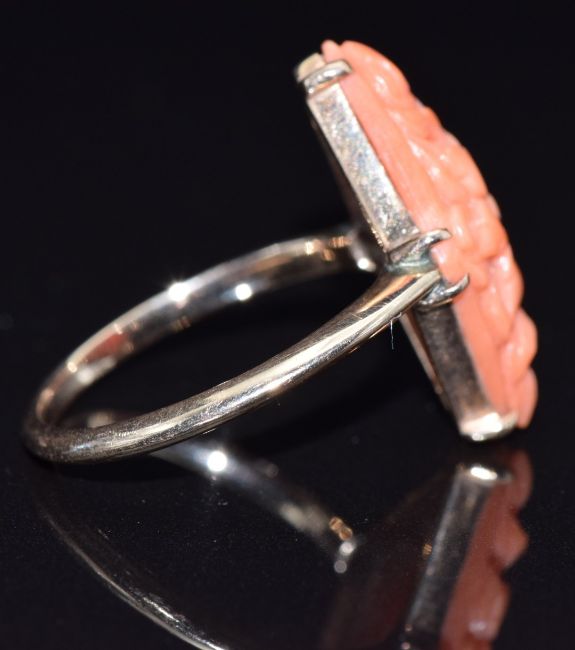 A 9ct gold ring set with carved coral, size M, 2.9g