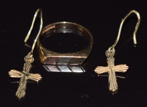 A pair of 9ct gold cross earrings and 9ct gold tri-coloured ring, 2.4g