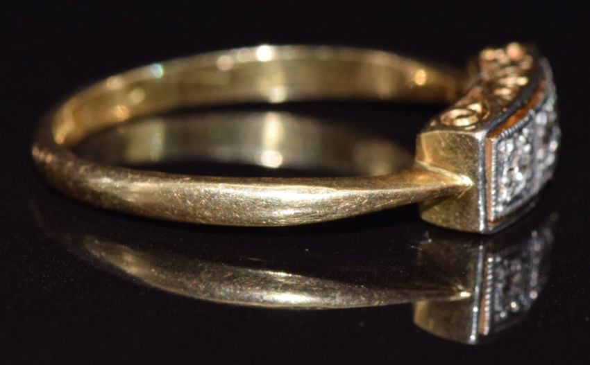 An 18ct gold ring set with three diamonds in a rectangular platinum setting, size M/N, 2.3g
