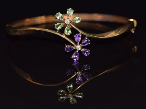 A 9k gold bangle set with amethysts and peridot in two floral clusters, 7.5g