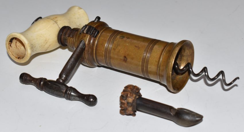 19thC side action brass corkscrew with bone handle and a carved 19thC horn or treen whistle, H18cm