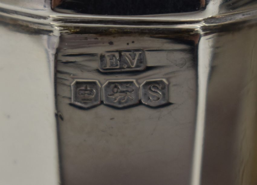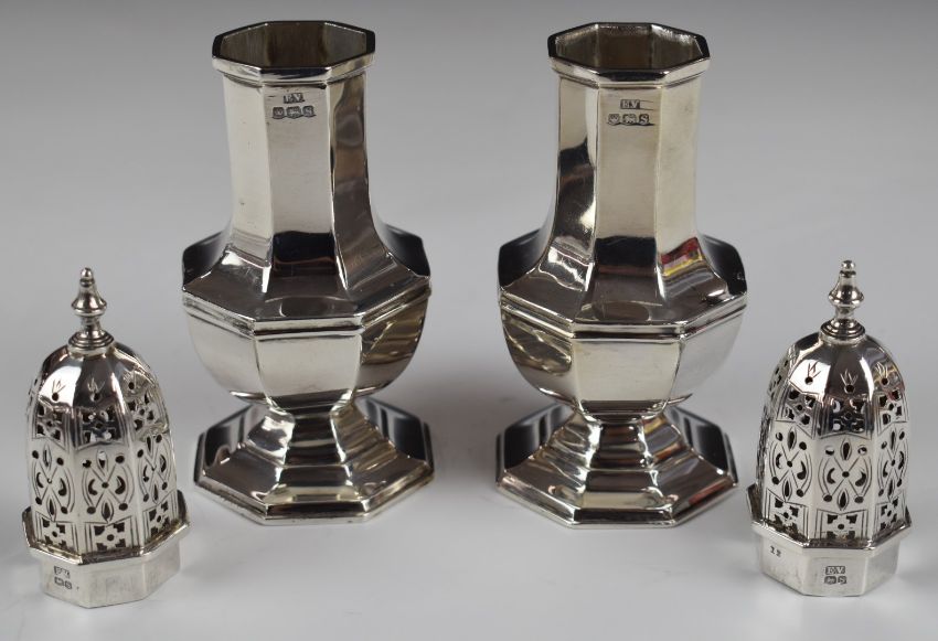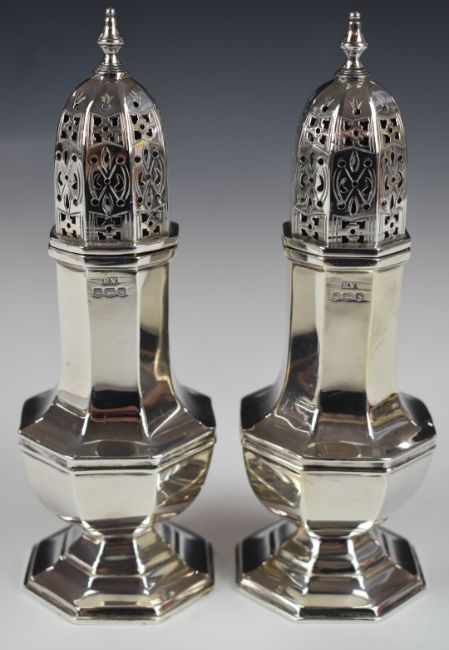 Pair of George V hallmarked silver sugar casters of octagonal baluster form, Sheffield 1935, maker Viner's Ltd, height 17cm, weight 290g