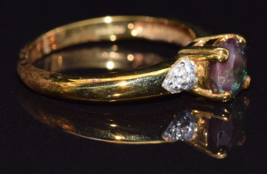 A 9k gold ring set with colour change andesine and diamonds, size M, 2.7g