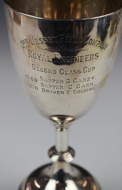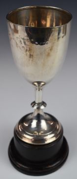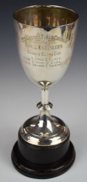 Edward VII hallmarked silver goblet or trophy cup with inscription to the 2nd Wessex Field Company Royal Engineers, Birmingham 1907, maker Adie Brothers Ltd, weight 261g, on stained wood base, height of goblet 21cm, height including base 26cm