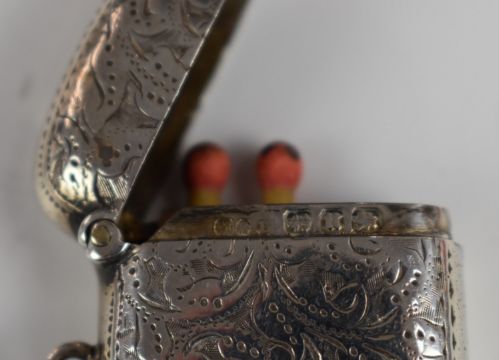Hallmarked silver items comprising Victorian vesta case, Birmingham 1894, maker Minshull & Latimer, small compact pendant, hexagonal pill box, folding twin bladed knife, length when extended 13.5cm, hallmarked silver lidded painted circular scent bottle and an unmarked retractable button hook