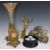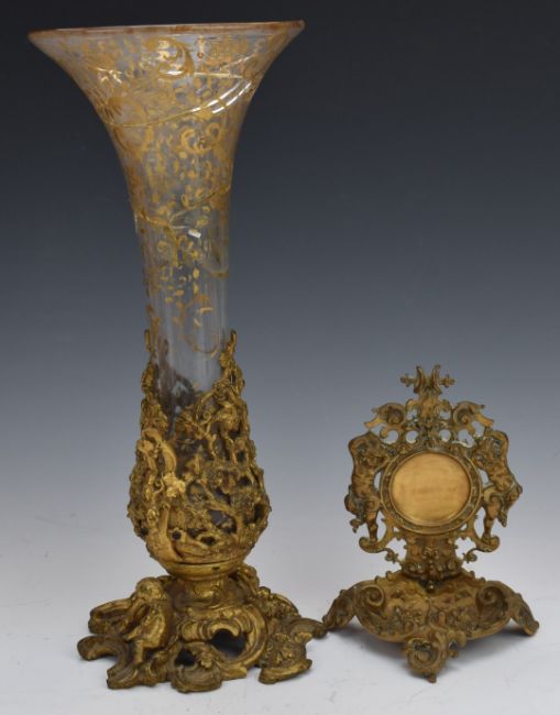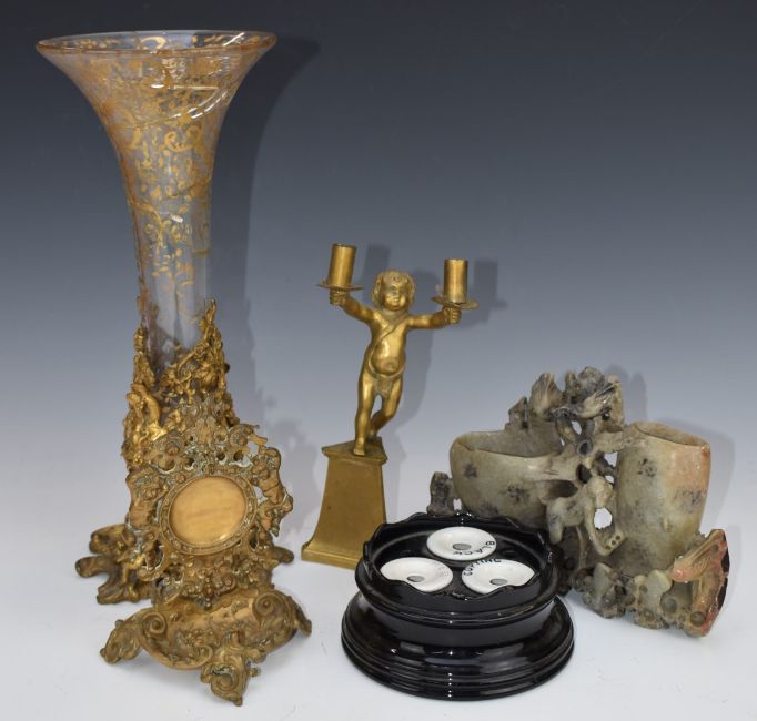 Bronze figural candlestick with plinth, brass pocket watch holder, Chinese soapstone spill vase, inkwell etc