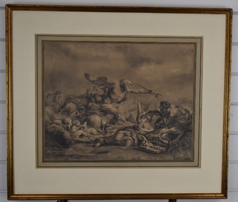 Quos Ego ou Neptune apaisant les flots, classical style pencil drawing with stamp to lower centre H DUP B and initialled lower right EB, 38 x 48cm, in gilt frame