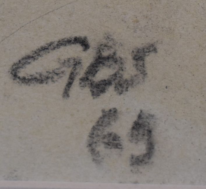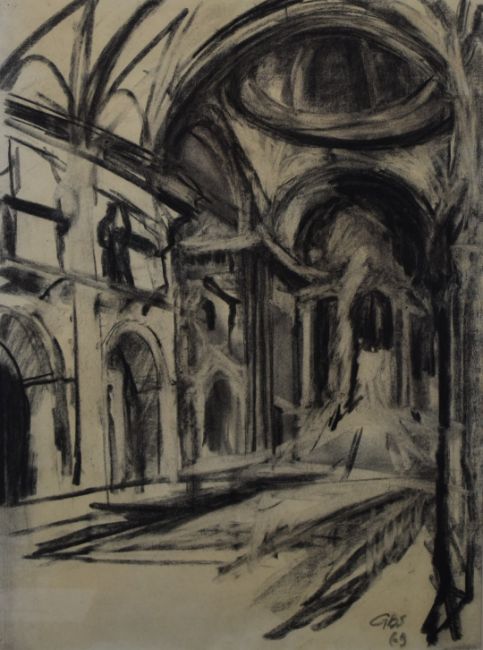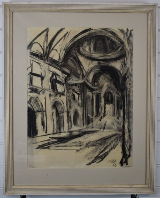 Garth B Scott, pupil of David Bomberg and part of the Borough group, abstract charcoal architectural study 'Nave', initialled and dated 65 lower right, 61 x 45cm, with labels verso