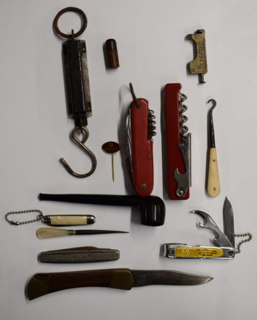 Table top display cabinet containing collectables including folding knives, enamel badges including Daily Mail Teddy Tail League, Army Cadet Force, LARP Civil Defence instructor, Dixon collapsible cup and attendance medals
