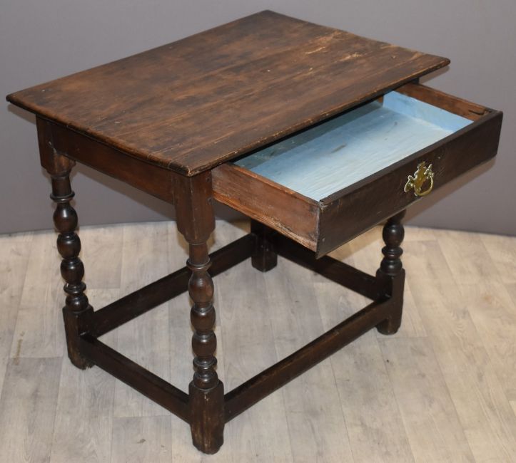 Antique oak peg jointed hall table with single drawer, W77 x D53 x 77cm
