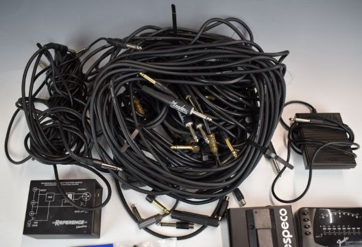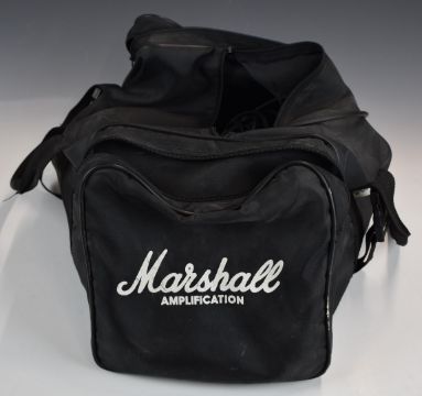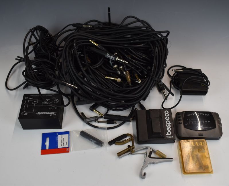 A collection of electric guitar related items to include auto tuner, leads, capos, pedal etc, in a Marshall carry bag. Plus various electrical cables.