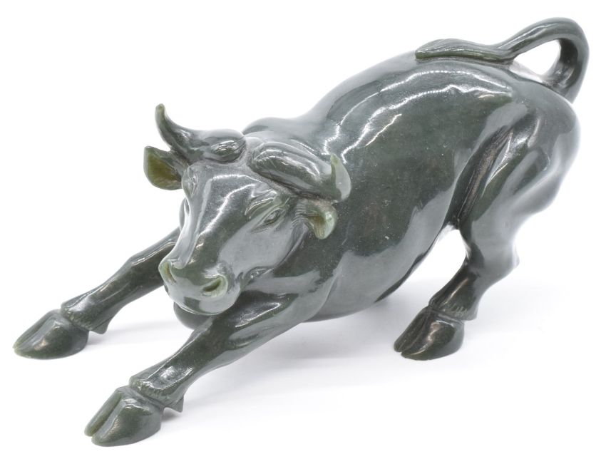 Chinese jade or hardstone figure of a bull, length 21cm