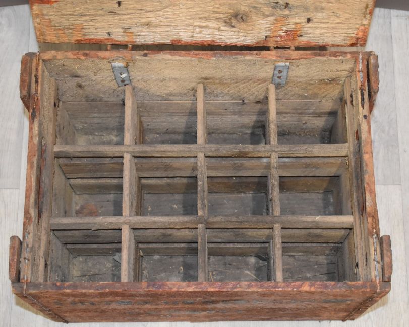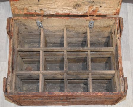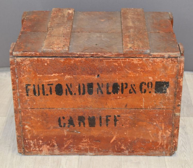 Vintage wooden drinks crate for Fulton Dunlop and Co, Cardiff, with hinged lid, W47 x D33 x H34cm