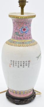 Chinese Republic style vase converted to a lamp, on carved wooden base, H40cm excluding fitting