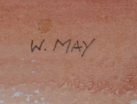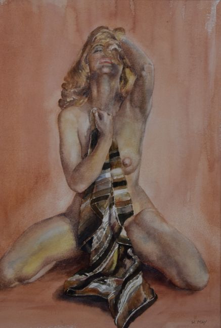 Wilfred May (1922-2007) watercolour study of a nude woman with a silk scarf, signed lower right 38 x 26cm, in gilt frame