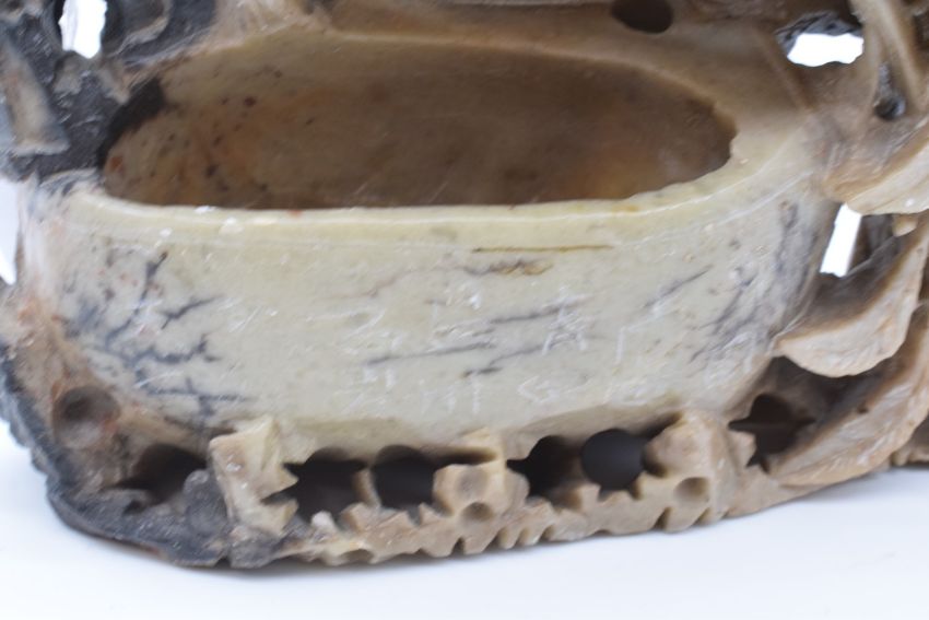 Two Chinese carved soapstone spill vases, one decorated with a monkey, L18cm